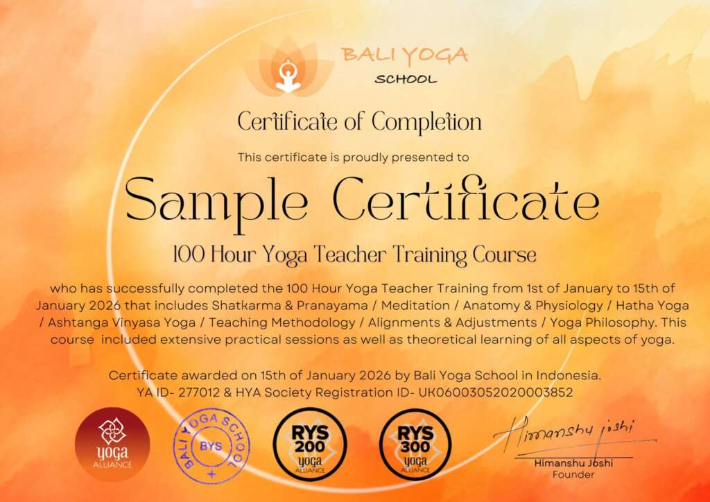 Sample Certificate for 100 Hour Yoga Teacher Training in Bali